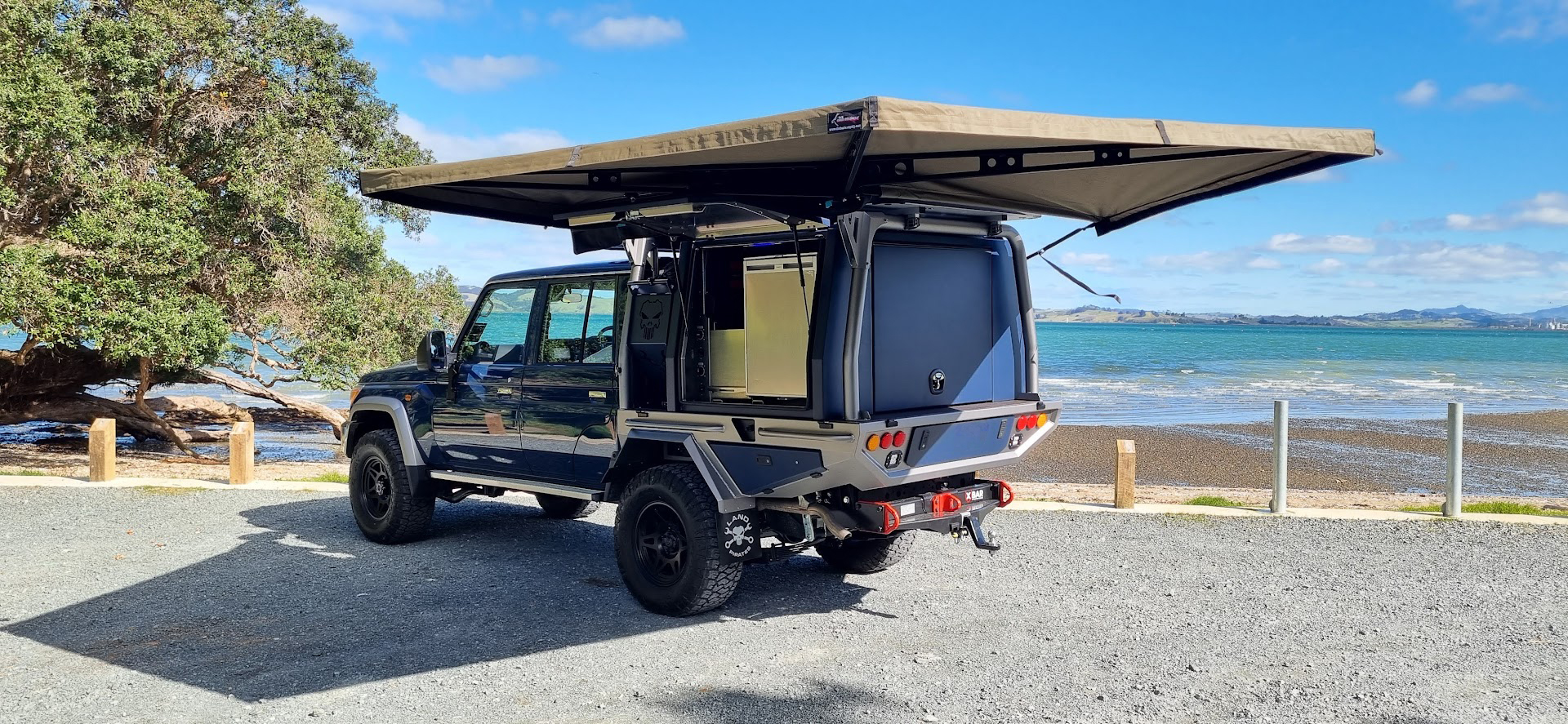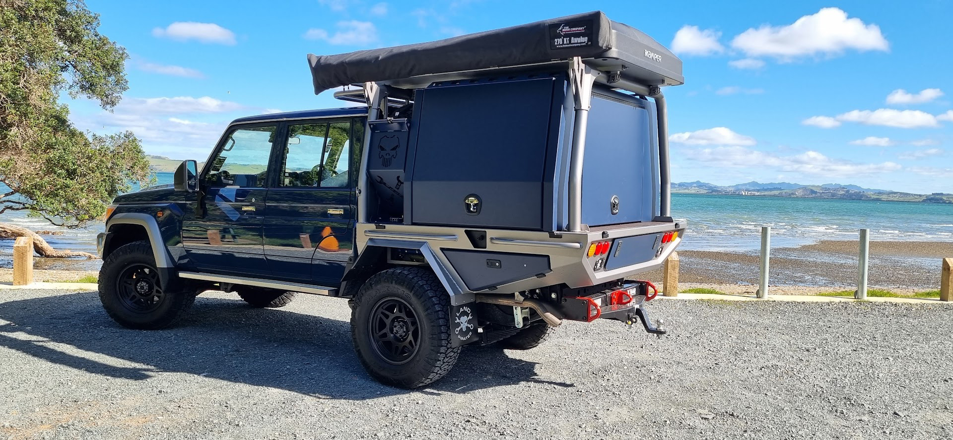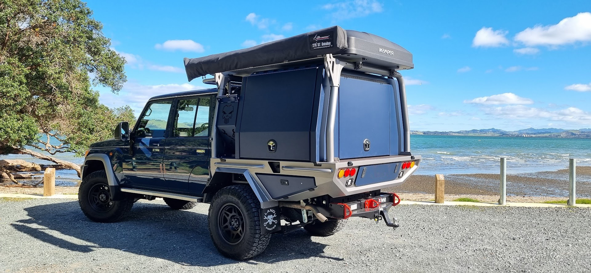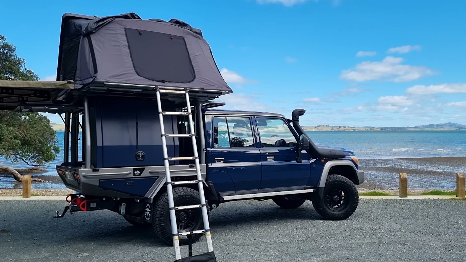 Ultimate Overland Expedition Vehicle Engineered for off-grid performance, this fully equipped 4×4 overland rig blends rugged durability with modern convenience. Built on a heavy-duty Toyota Land Cruiser 79 Series platform, it includes a full canopy system with a rooftop tent, 270″ swing-out awning, and rear-access utility ladder. Inside the canopy, you’ll find a built-in fridge/freezer, custom racking, integrated storage lighting, and utility panels-making it the perfect mobile kitchen or gear hub. Finished in matte navy with black accents, the vehicle also boasts all-terrain tires, rock sliders, a snorkel, and reinforced steel bumpers for serious backcountry exploration. From weekend adventures to cross-continent expeditions, this vehicle is ready to go wherever you are.